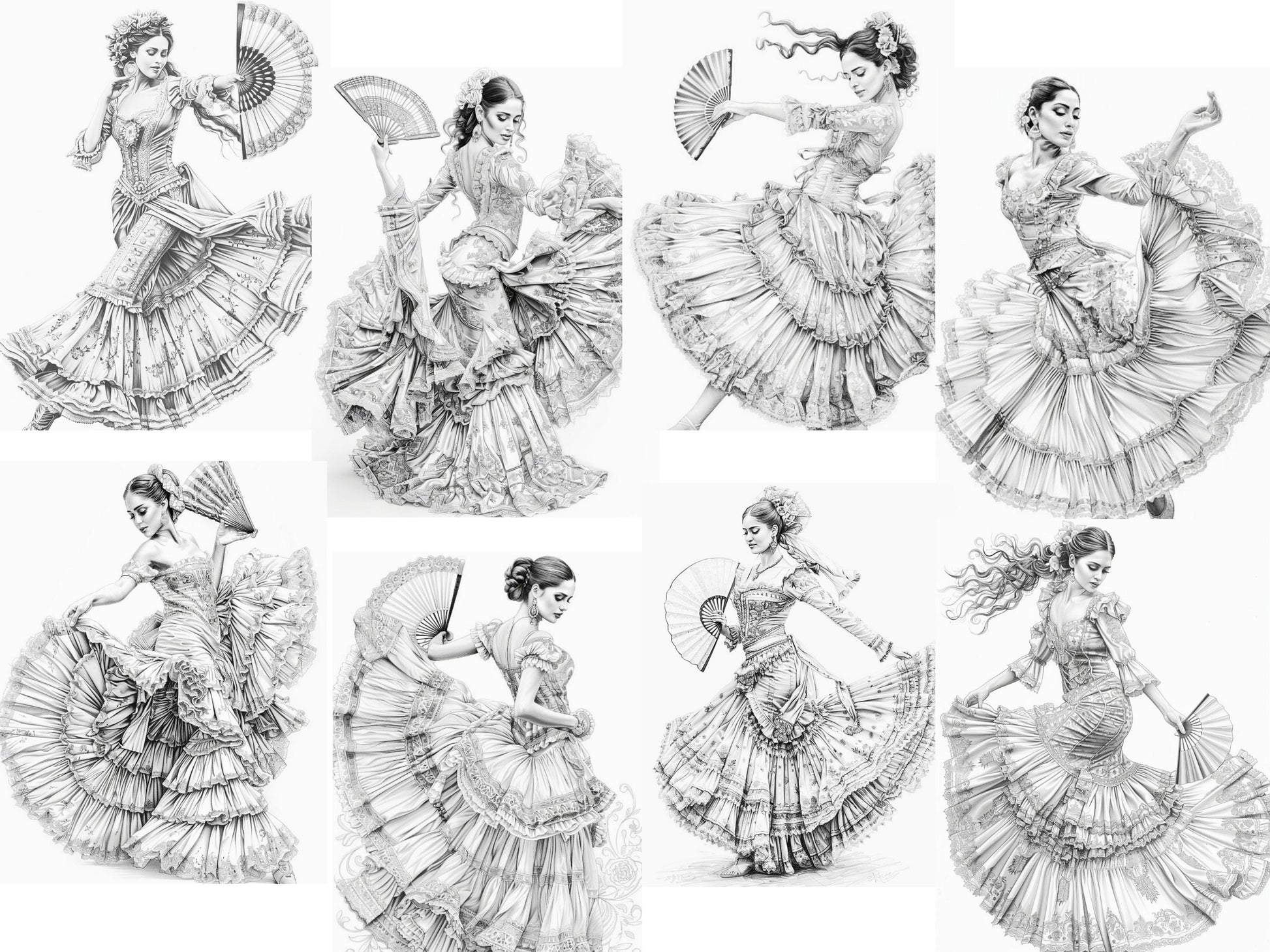 Explora el cautivador mundo del flamenco con nuestro libro para colorear de Bailarina flamenca. Sumérgete en el reino de la expresión creativa mientras coloreas vibrantes bailarinas en escala de grises. Perfecto para adultos que buscan relajación y realización artística, este libro para colorear de danza presenta impresionantes ilustraciones de bailarines españoles, que ofrecen una deliciosa combinación de riqueza cultural e inspiración artística. Sumérgete en la elegancia y la pasión del baile flamenco con esta encantadora experiencia para colorear.