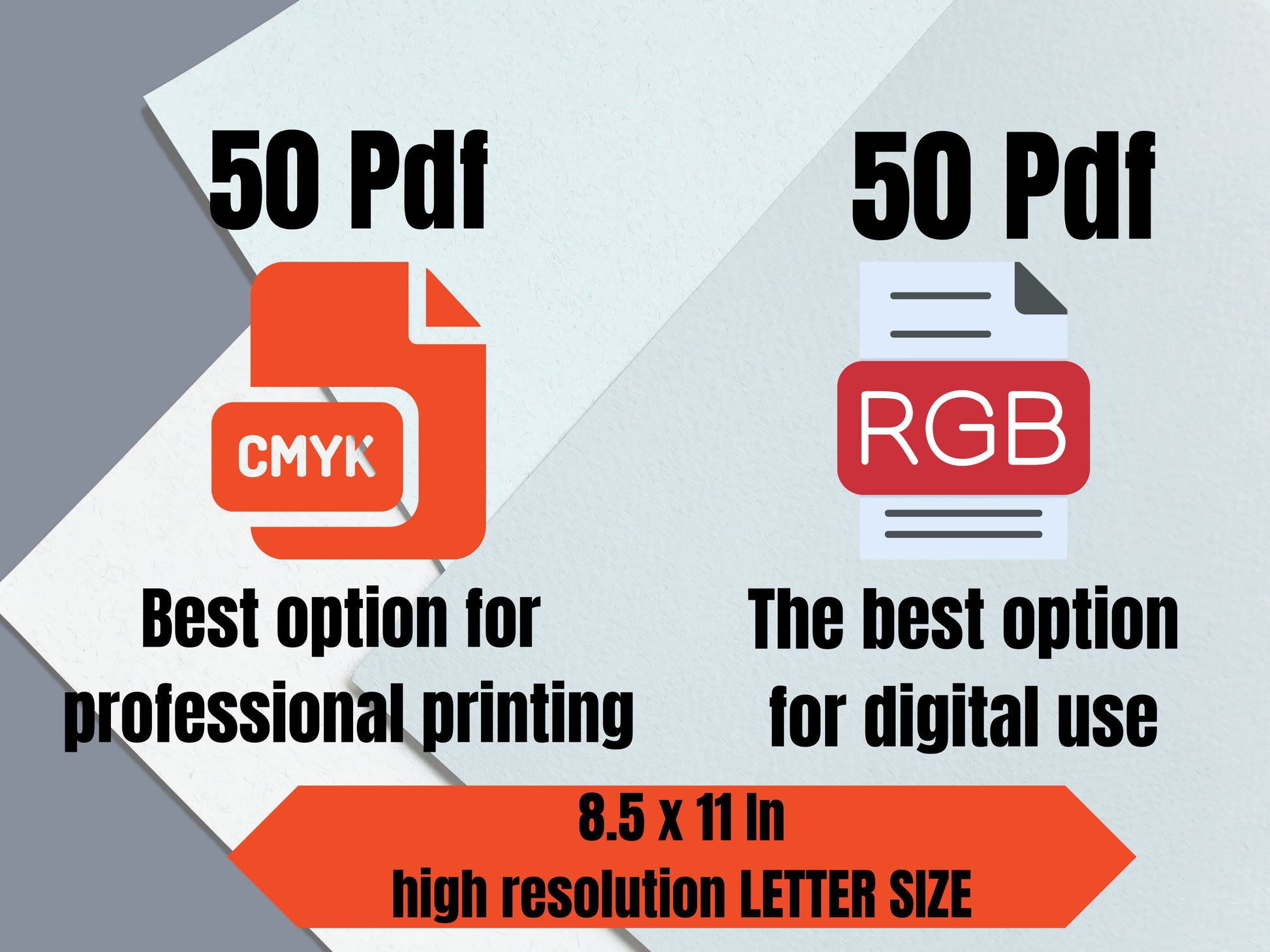 Cada libro para colorear se proporciona en formato PDF y ofrece dos opciones: una en formato CMYK y otra en formato RGB. ¿Te preguntas qué significa esto? El formato CMYK es ideal para impresiones de alta calidad, mientras que el formato RGB es perfecto para visualización en pantalla, lo que te brinda la flexibilidad de imprimir tus creaciones o disfrutarlas digitalmente en tu dispositivo favorito.