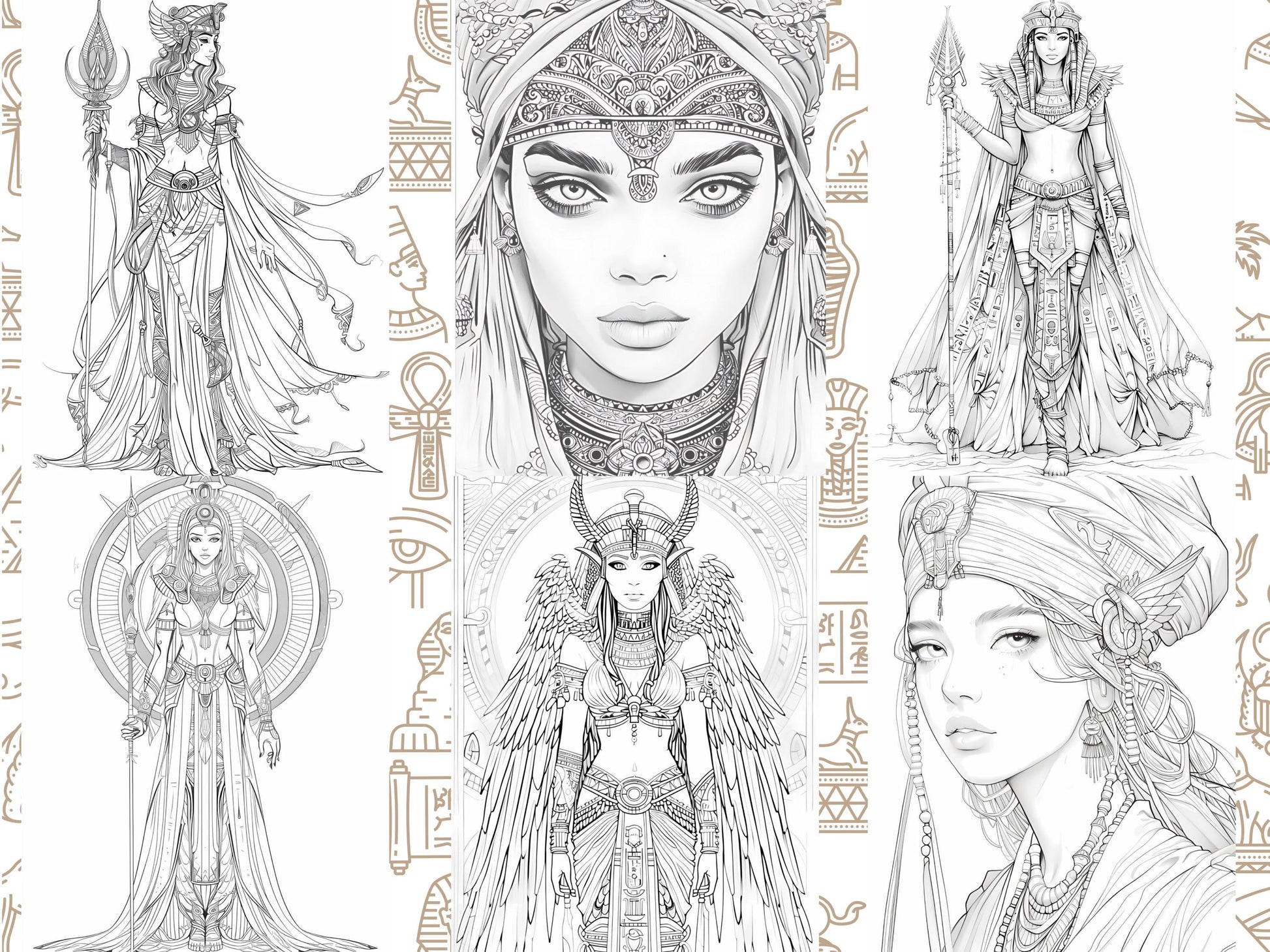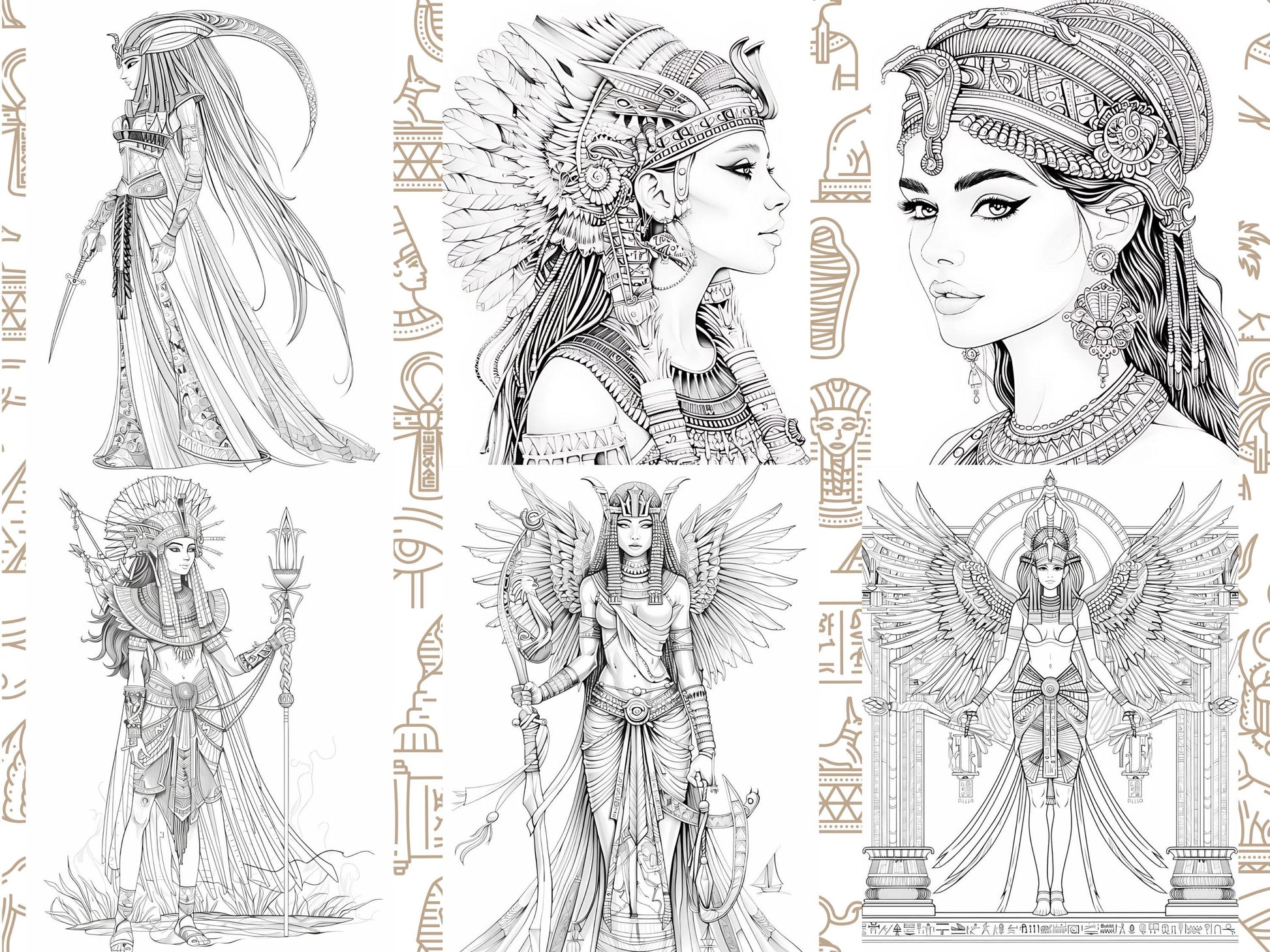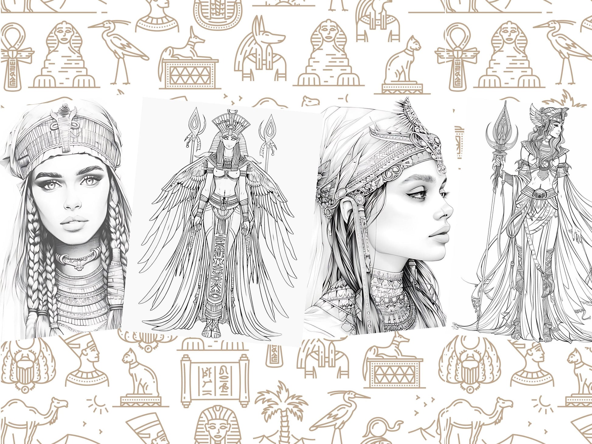 Princesas egipcias: Representaciones elegantes y majestuosas de princesas egipcias con trajes tradicionales, perfectas para colorear.
