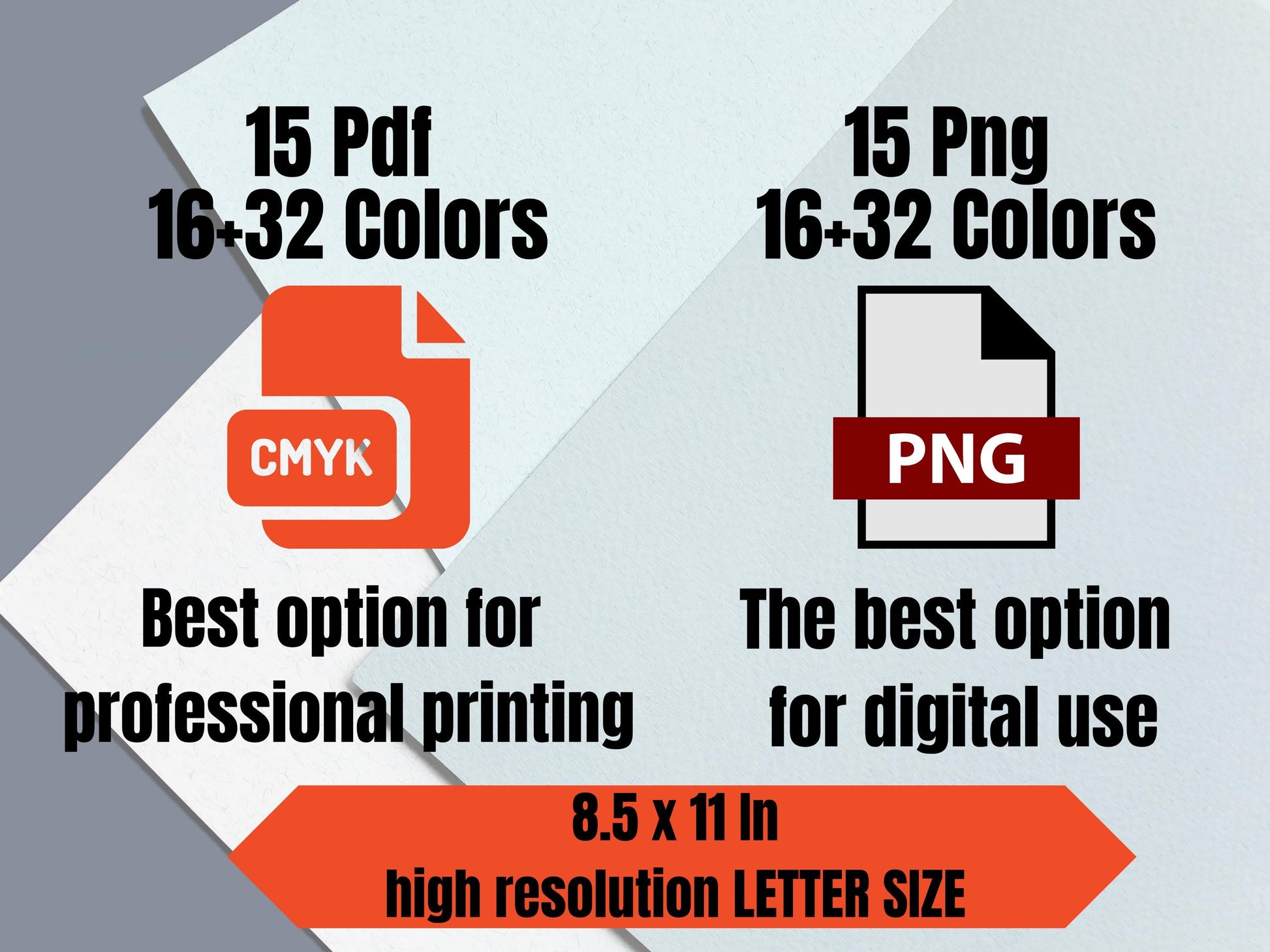 15 diseños para colorear por números, cada uno en versiones claras (16 colores) y oscuras (32 colores).