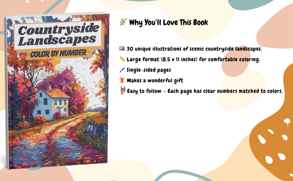 Countryside Landscapes – Color by Number Escape into the Peaceful Beauty of the Countryside. Bring charming rural scenes to life with this relaxing Color by Number coloring book. Perfect for beginners and experienced colorists, Countryside Landscapes – Color by Number features delightful countryside illustrations—cozy cottages, blooming gardens, rolling hills, and tranquil rivers.Simply follow the numbers to create beautiful artworks without the stress of choosing colors.