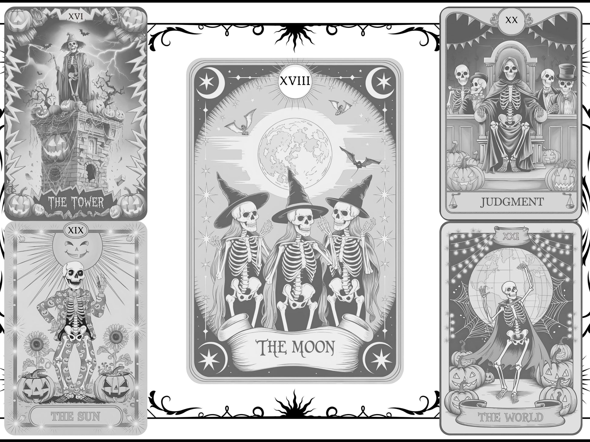 Sumérgete en el místico mundo del tarot con un toque espeluznante en nuestro Libro para Colorear de Esqueletos de Tarot - Edición Halloween. Ideal para los amantes de las páginas para colorear de Halloween y los libros para colorear en escala de grises, esta colección única incluye 22 detalladas ilustraciones de cartas del tarot en escala de grises, cada una diseñada con intrincados esqueletos para capturar la inquietante esencia de Halloween.