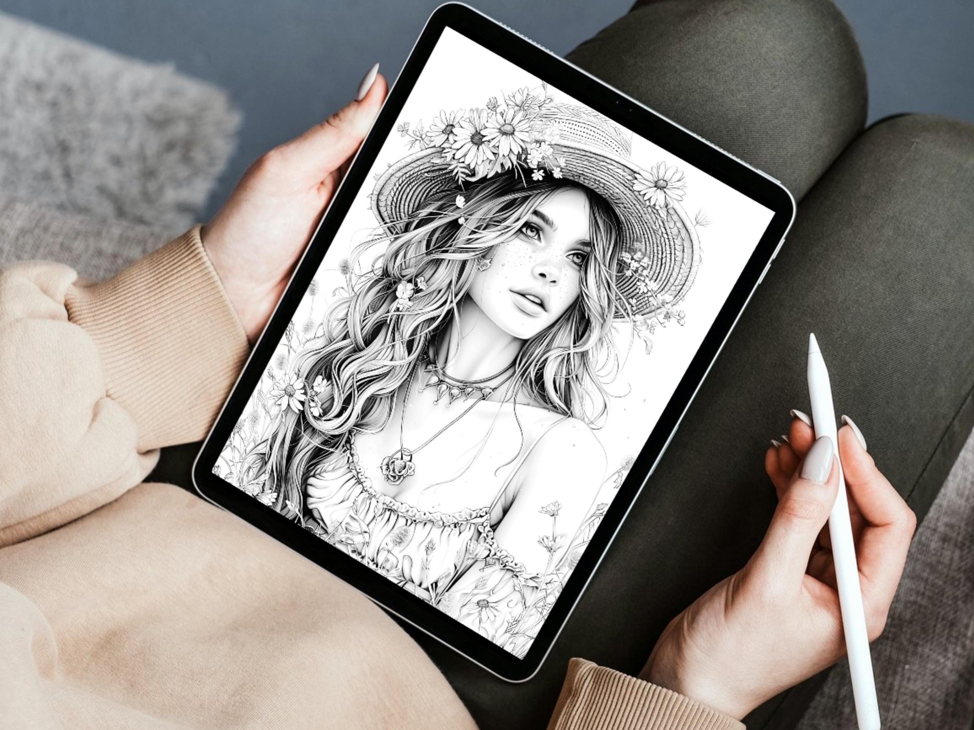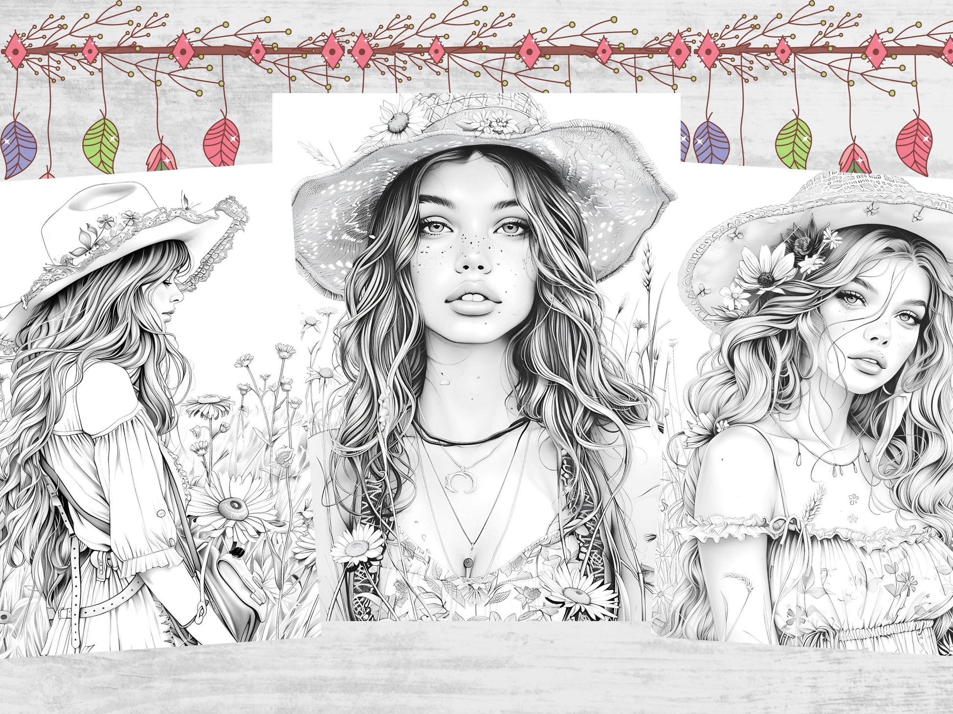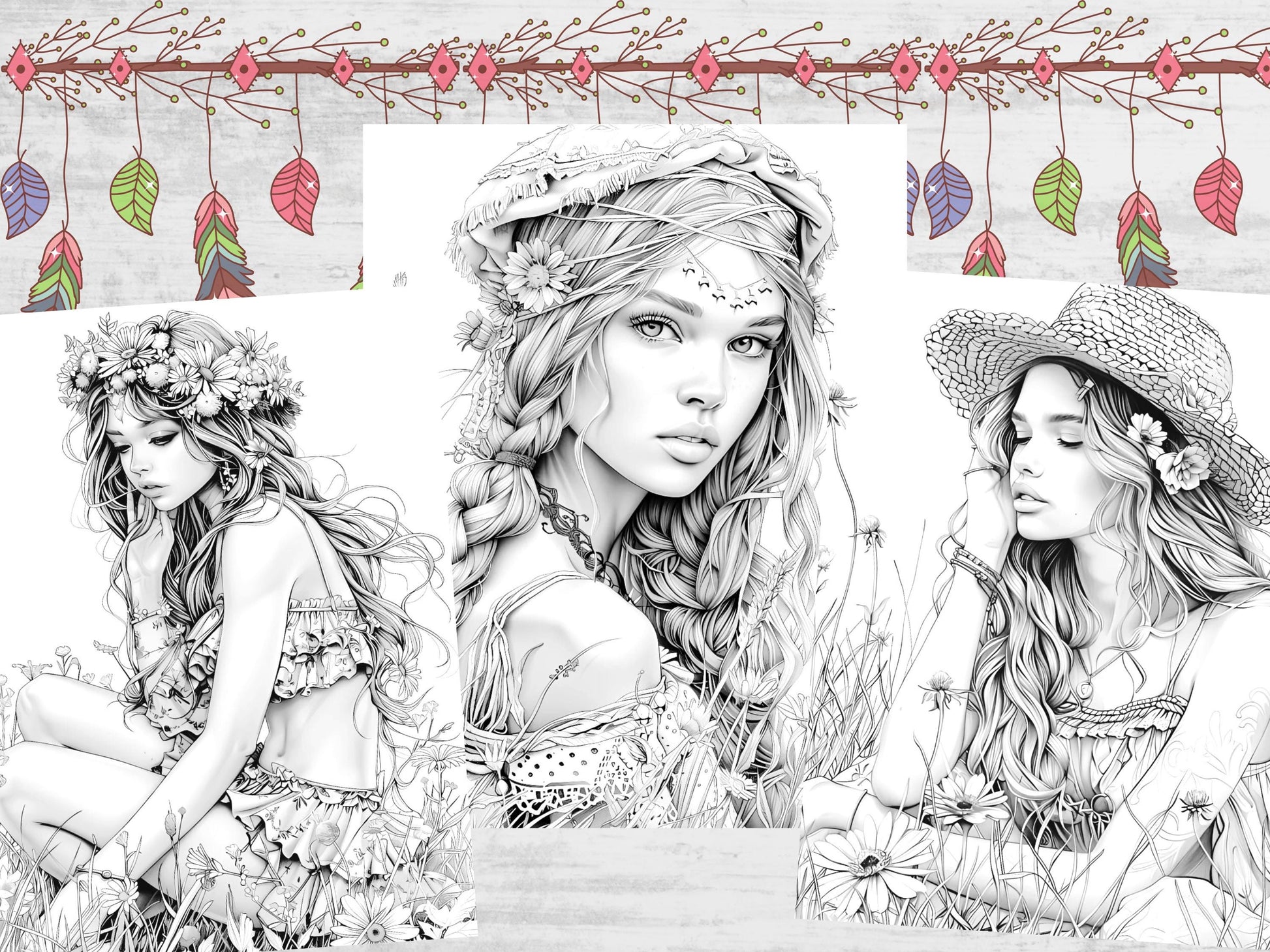 Descubra la belleza del estilo bohemio con nuestro libro "Boho Coloring Pages". Cada página presenta retratos en escala de grises de chicas bohemias con gran detalle, que capturan la esencia de la moda boho y la elegancia de espíritu libre. Diseñadas para adultos coloristas, estas intrincadas ilustraciones brindan una combinación perfecta de relajación y creatividad.