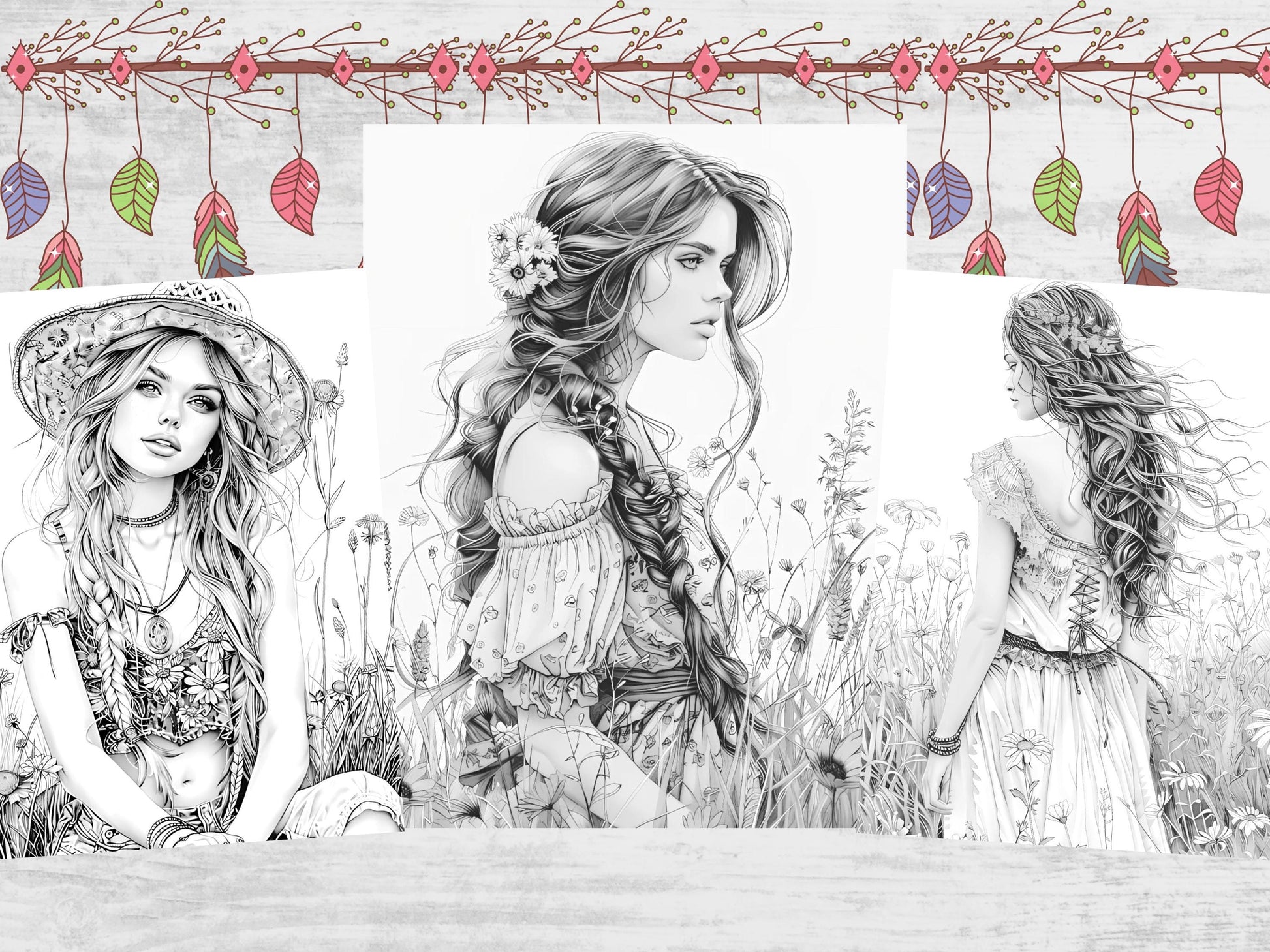 Chicas boho para colorear: hermosas chicas boho en varias poses y configuraciones.